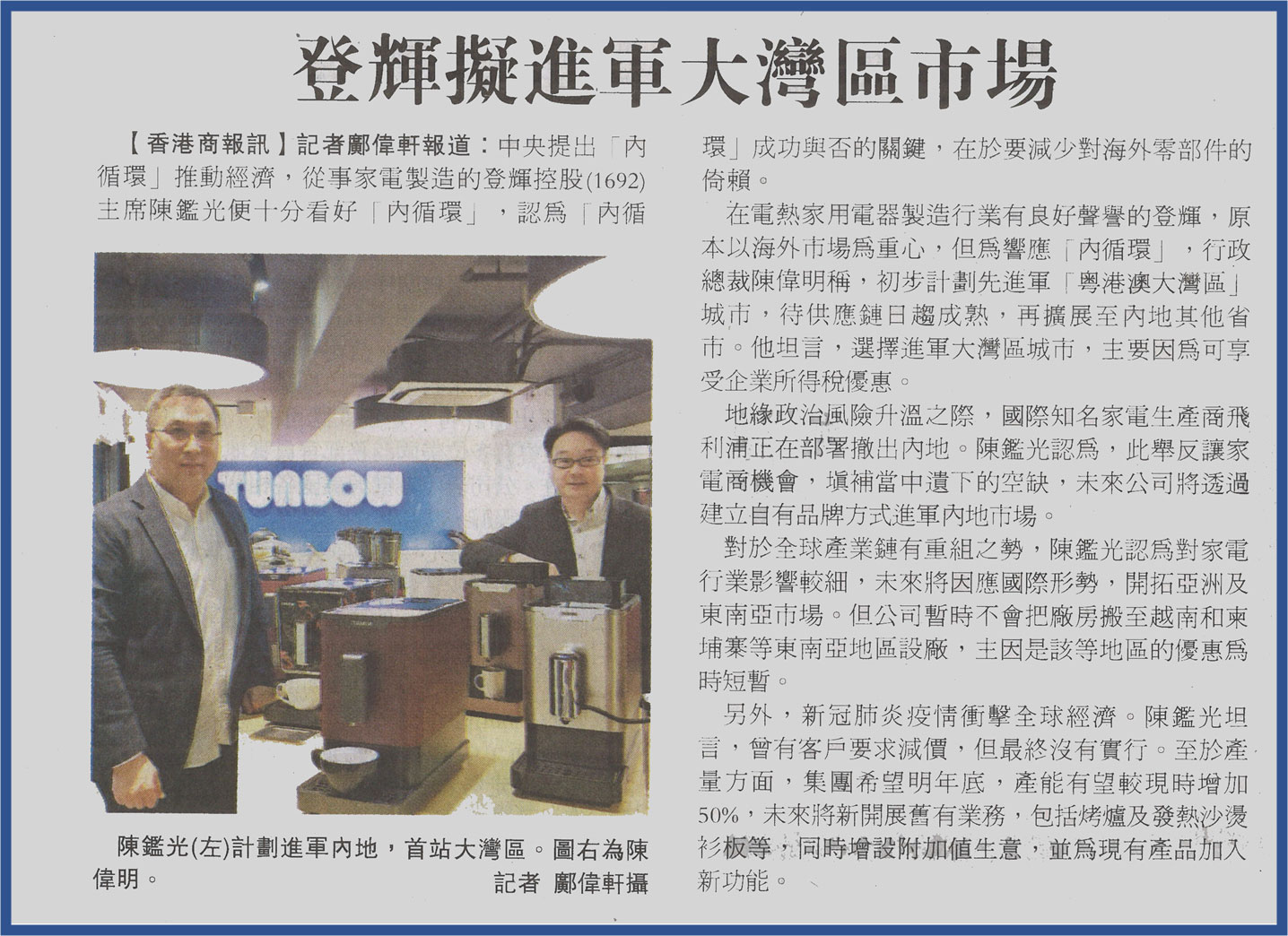 The local newspaper, Hong Kong Commercial Daily, has conducted an interview with our Group’s Chairman, Dr. Chan Kam Kwong, Charles, over the topic of “ Economic Internal Circulation” promoted by the PRC government. Dr. Chan is very optimistic about the "Economic Internal Circulation" and believes that the key to success lies in reducing the reliance on parts imported from overseas.